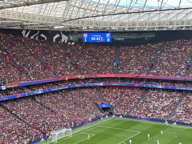 女足欧冠决赛进入到下半场后,圣马梅斯球场的屏幕上打出本场比赛的现场观众数量:50827人,上座率几乎达到100%,这一数字也创下了女足欧冠决赛层面的上座纪录。而一眼望去,这5万出头的观众中巴萨球迷至少占据了4.5万,甚至还要更多,而这其中也不仅仅包括本地球迷。